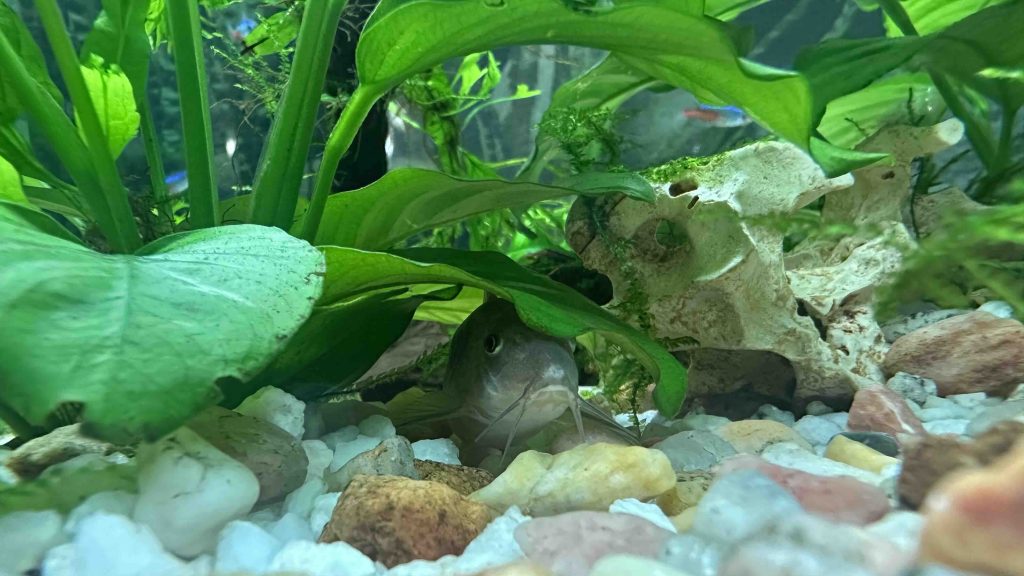 Los corydoras son peces pacíficos de fondo que viven en grupos y son excelentes limpiadores del acuario. Suelen moverse por el sustrato buscando restos de comida, lo que ayuda a mantener el fondo limpio y oxigenado.